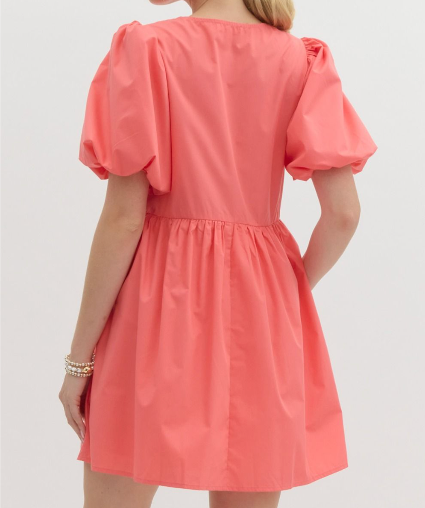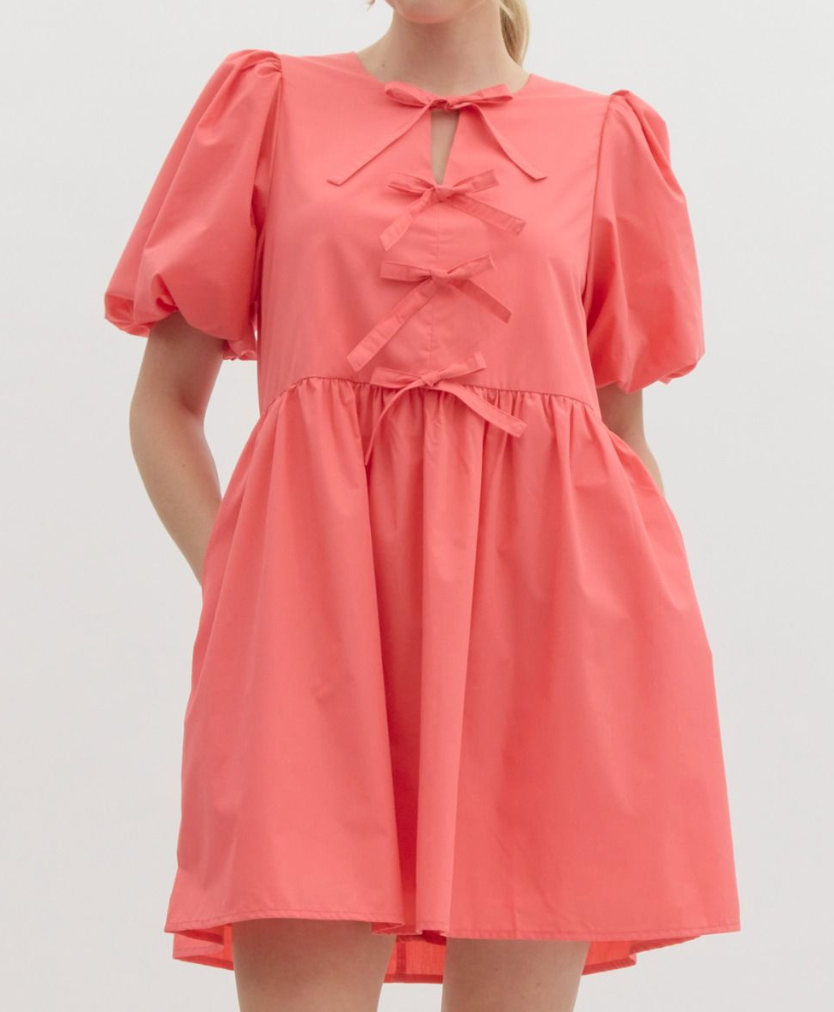 Solid bubble sleeve mini dress featuring ribbon detail at front. Elastic at cuff. Pocket at sides. Lined.