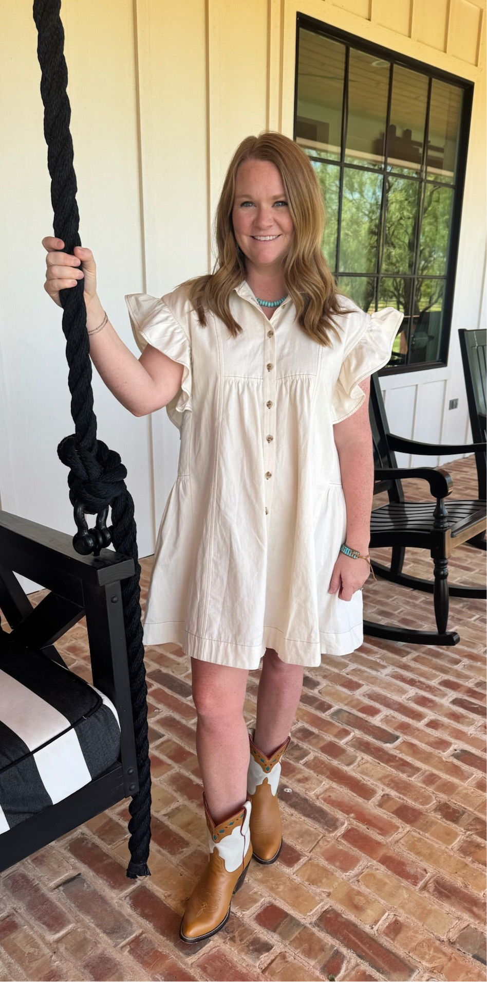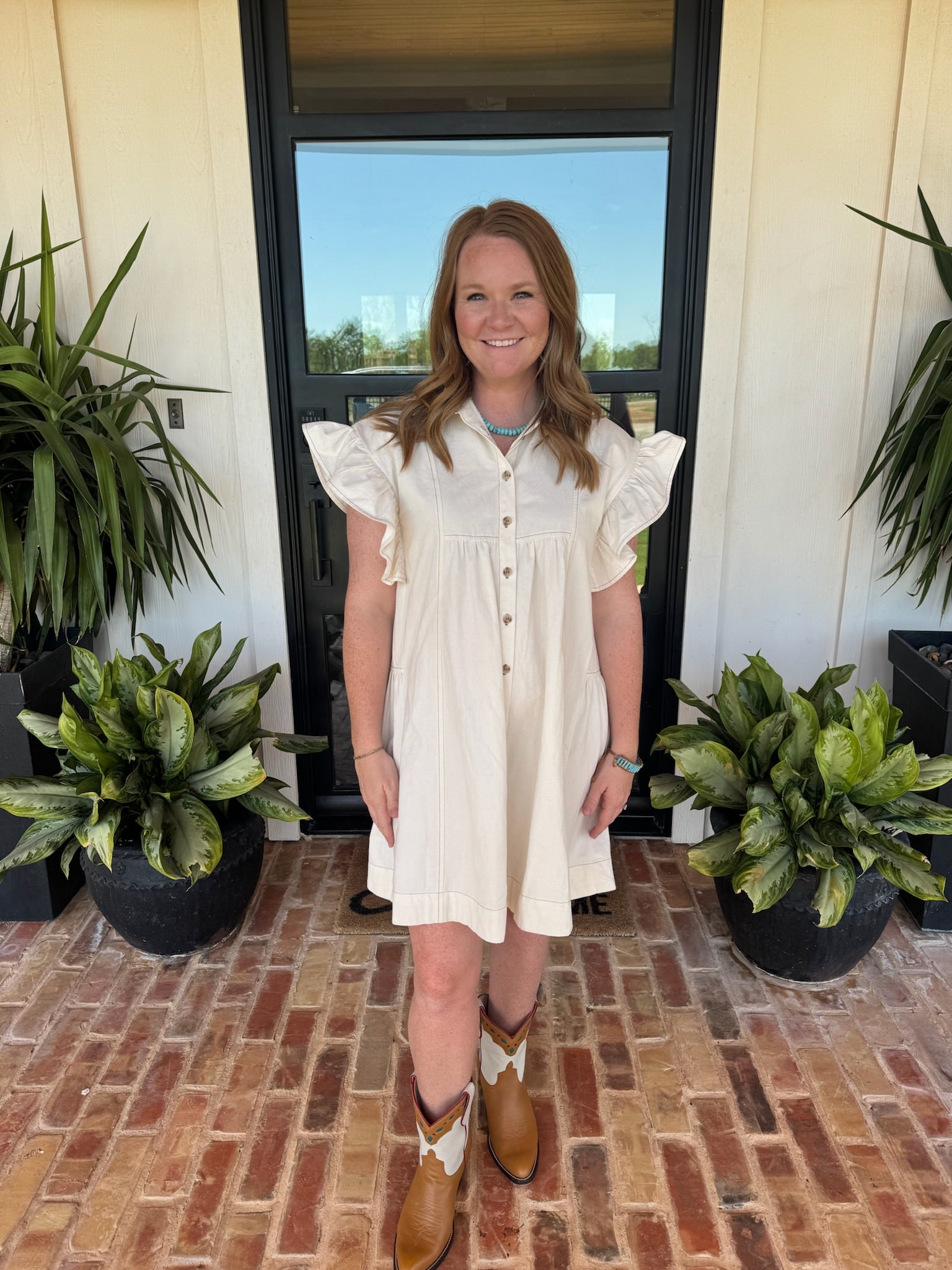 Cream flutter sleeve mini dress featuring exposed stitch detail. Full button down closure. Pockets at side. Lined. Woven. Non-sheer. Lightweight.
