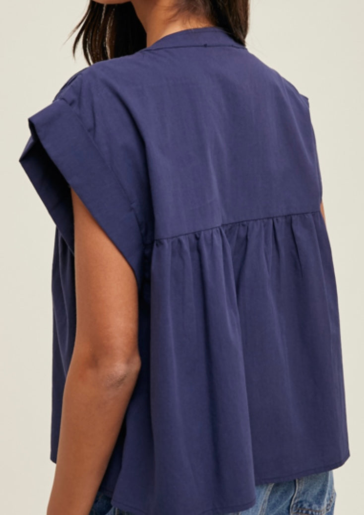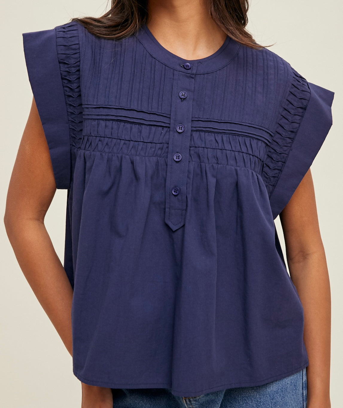 Pintucked capsleeve blouse with buttons. True to size. If between sizes, go up.
