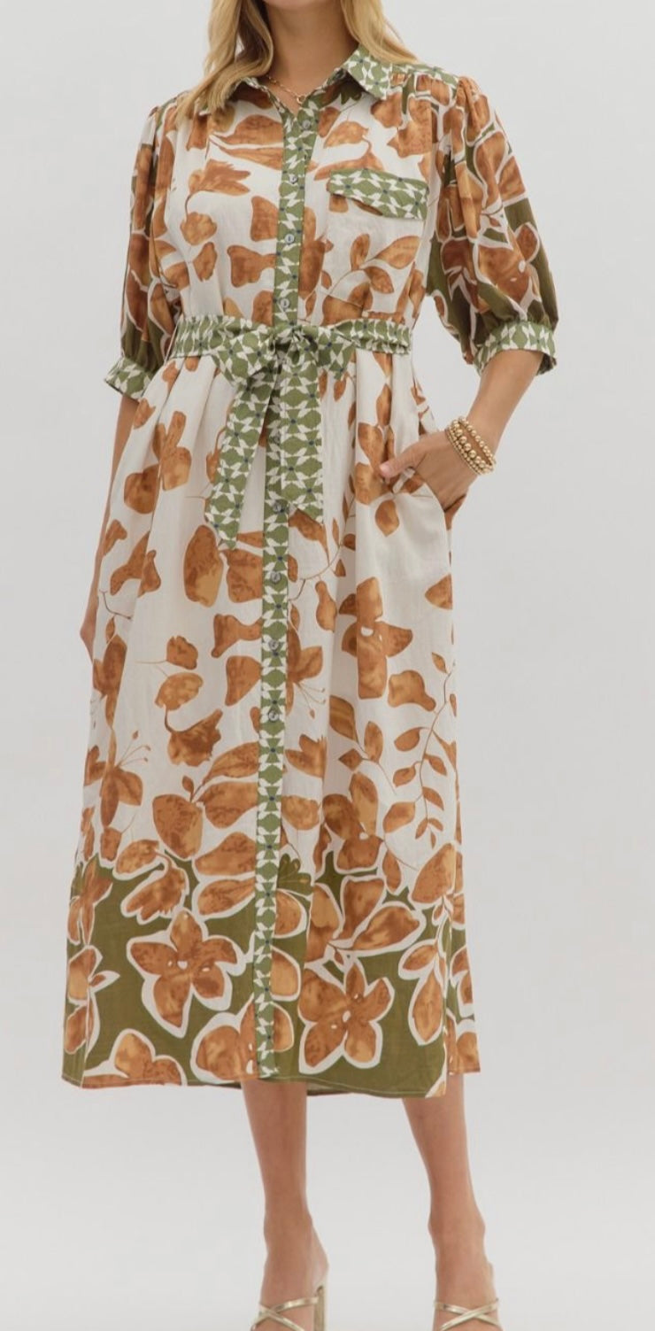 Botanical print ¾ sleeve midi shirt dress featuring abstract contrast band collar button front and removable belt. Side pockets. Lined. Woven. Non-sheer. Lightweight.
