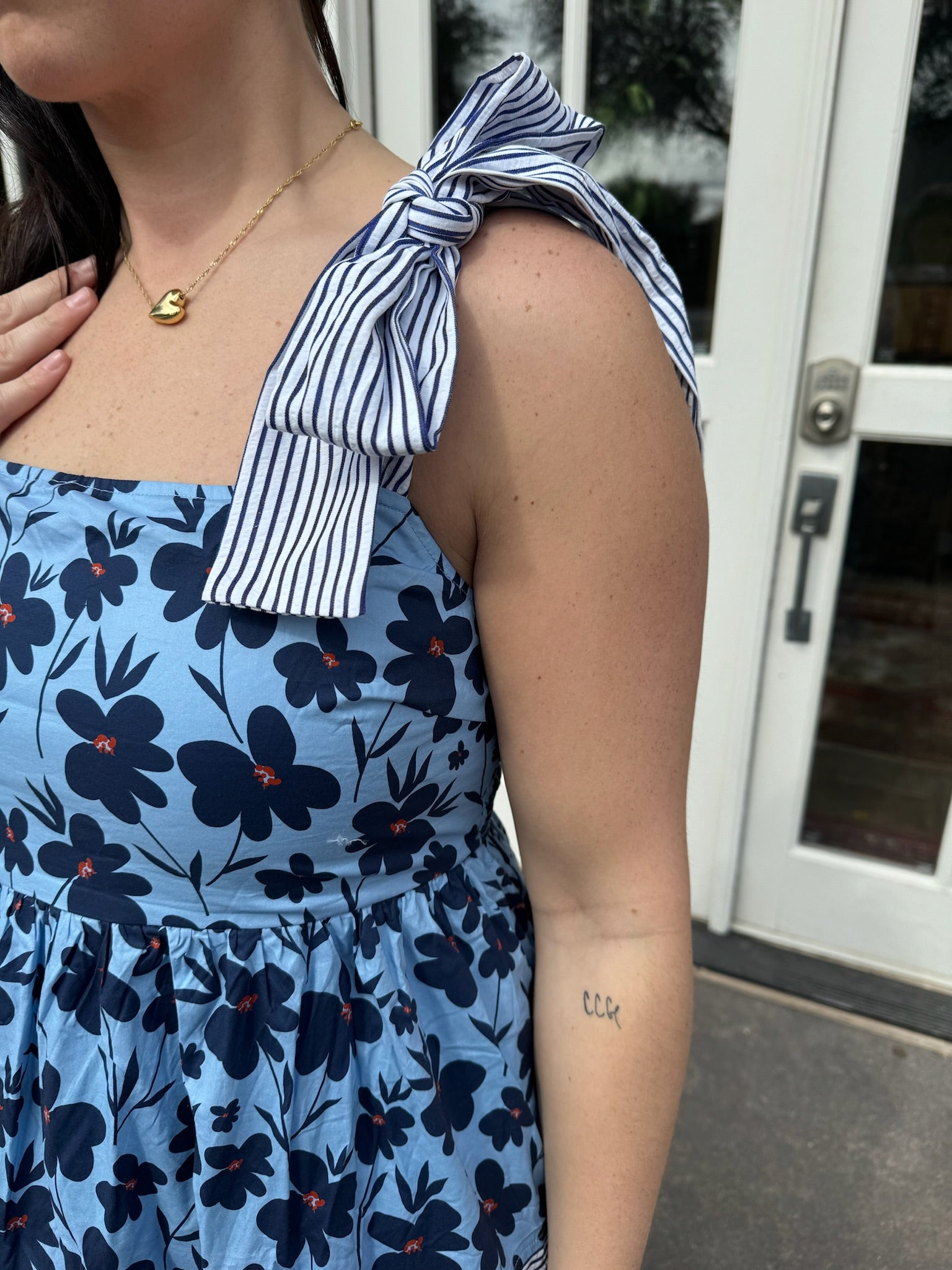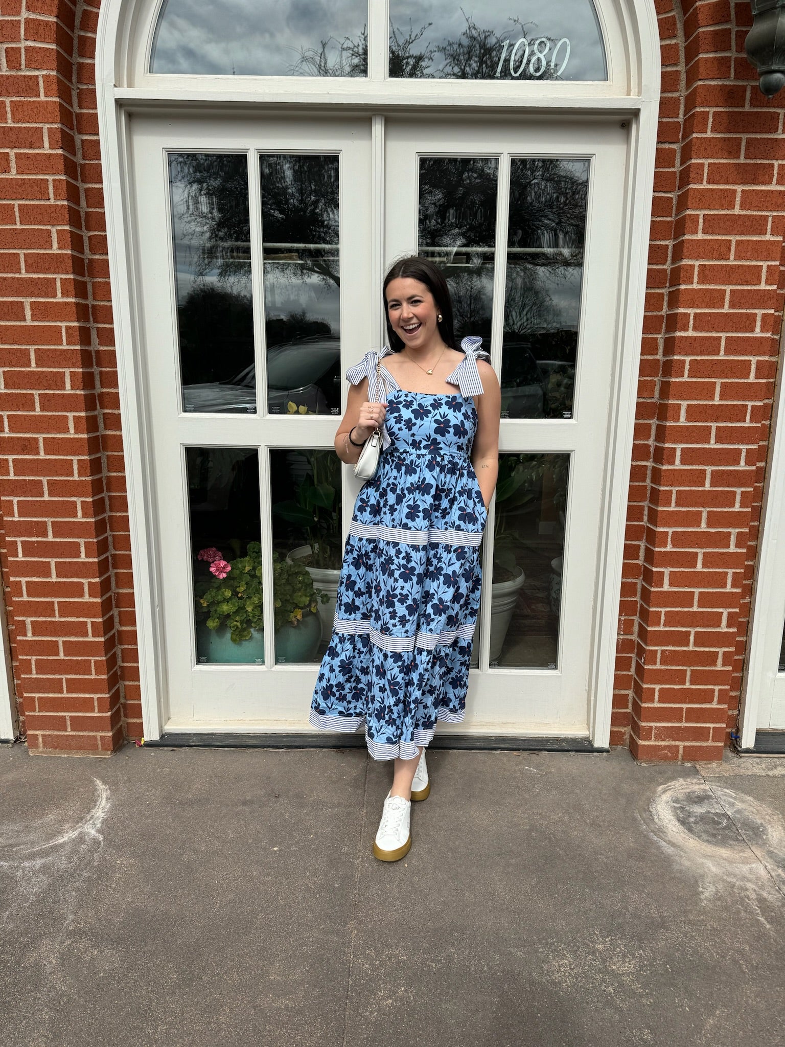 Floral print straight neck stripe pattern shoulder tie strap pullover tiered midi dress. Elasticated smocking panel at back. Pockets at side. Lined.