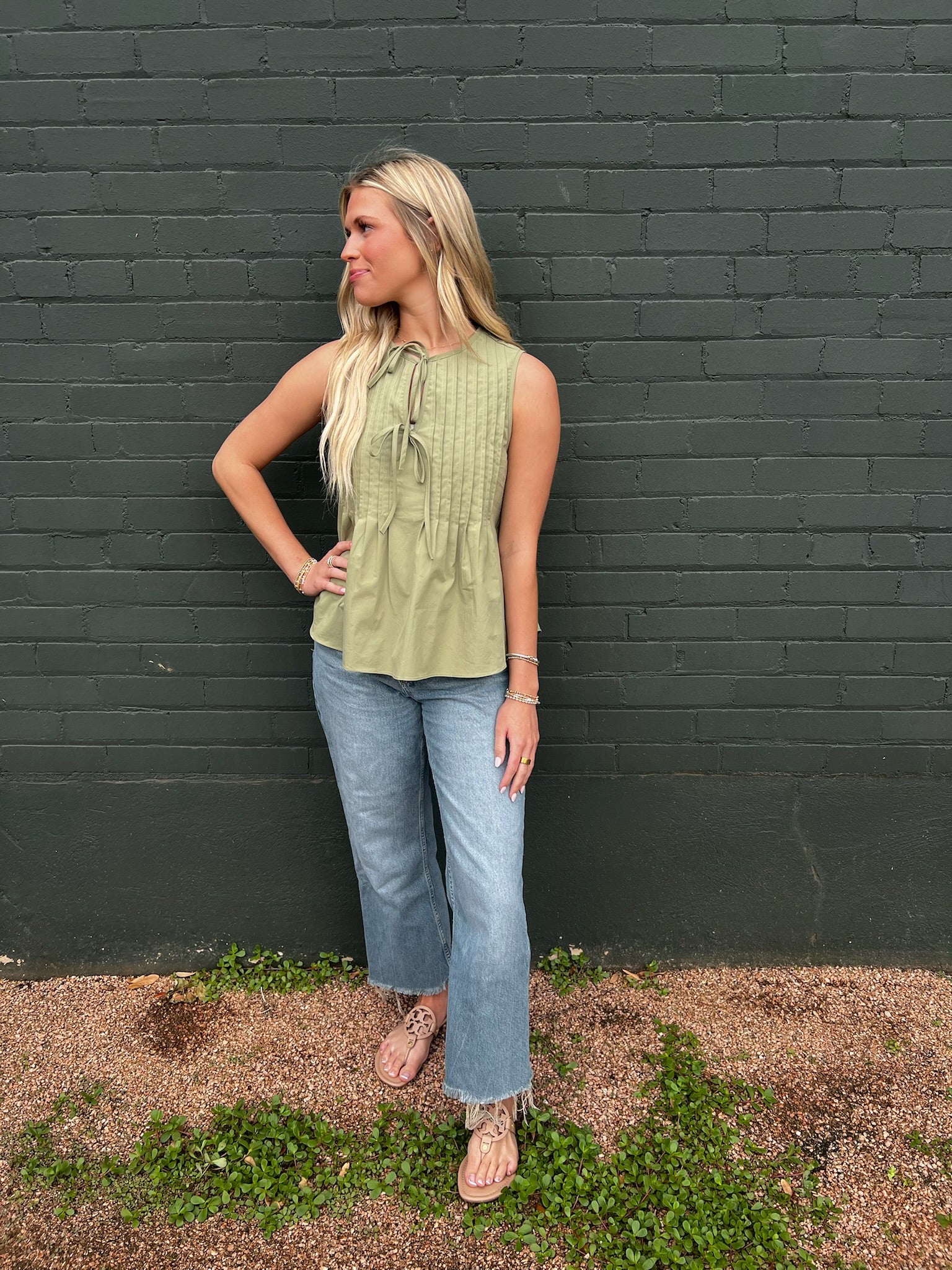 Pin-tuck tie detail sleeveless blouse in cotton poplin fabric. This sleeveless tank top features pin-tuck detail throughout front/back bodice, a round neck, and a keyhole at front with dual tie detail.