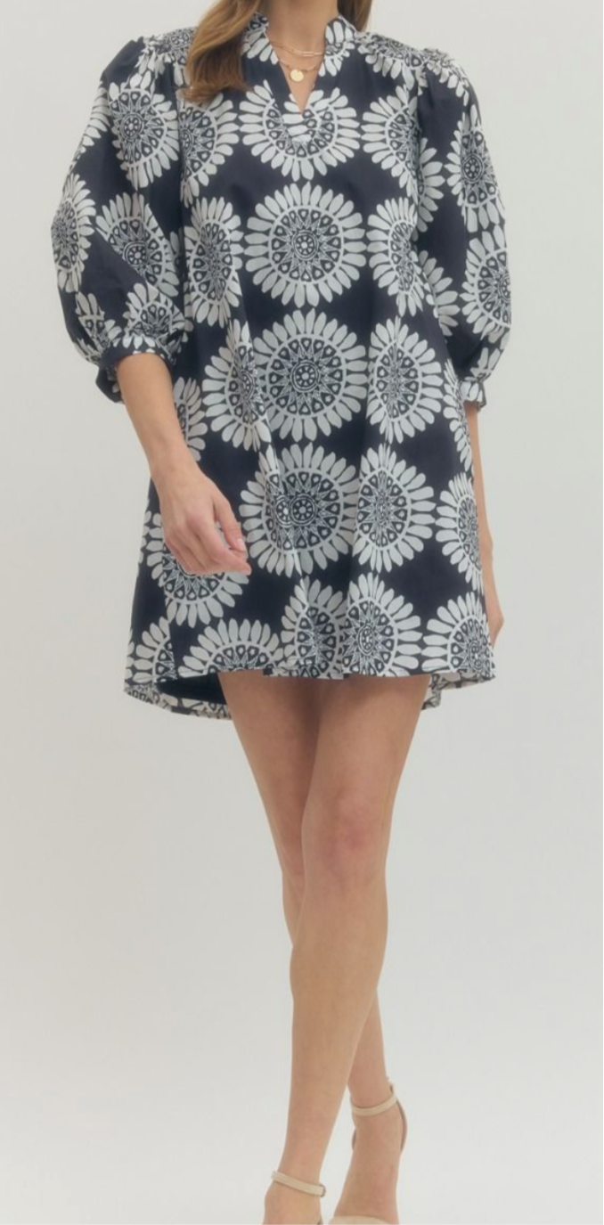 Print puff sleeve mini dress featuring V-neckline. Side pockets. Lined. Woven. Non-sheer. Lightweight.